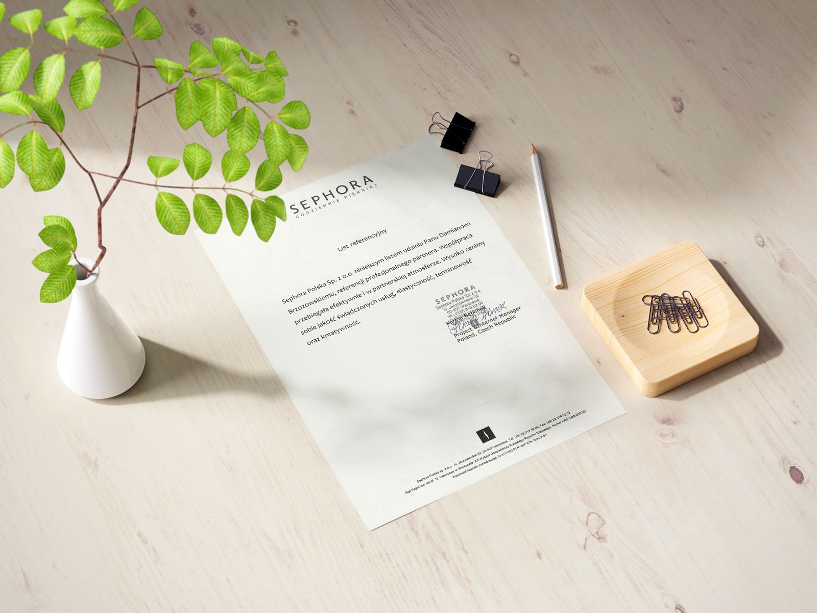 Sephora Polska Sp. z o.o. niniejszym listem udziela Damian Brzozowskiemu, referencji profesjonalnego partnera. Współpraca przebiegała efektywnie i w partnerskiej atmosferze. Wysoko cenimy sobie jakość świadczonych usług, elastyczność, terminowość oraz kreatywność.